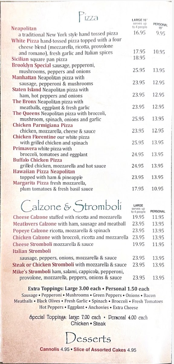 Sausage, Pepperoni, Mushrooms, Green Peppers, Onions, Bacon, Meatballs, Black Olives, Fresh Garlic, Spinach, Broccoli, Fresh Tomatoes, Hot Peppers, Eggplant, Anchovies, Extra Cheese